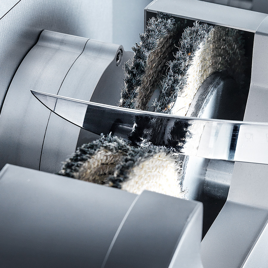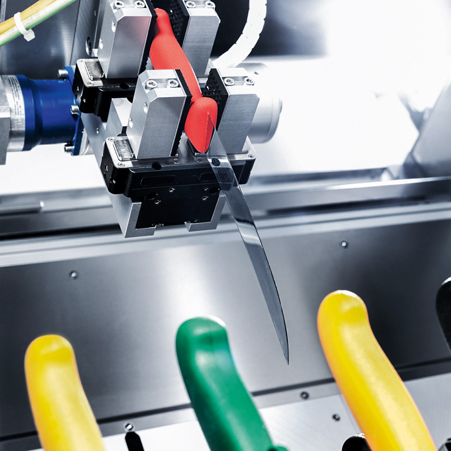 Le bras de préhension saisit et retire le couteau du magasin – la forme du couteau est enregistrée par un procédé de mesure optique – le couteau est affûté, démorfilé et poli – le bras de préhension replace le couteau traité dans le magasin.