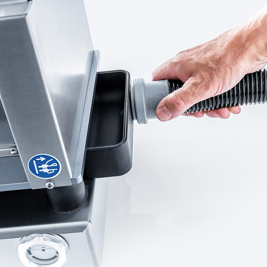 Outre le refroidissement par eau, l’EVO 5 peut être équipée en option d’une unité d’aspiration de la poussière de polissage. Le raccord pour système d’aspiration permet le branchement d’un aspirateur industriel standard, ce qui assure une protection optimale des voies respiratoires de l’opérateur.