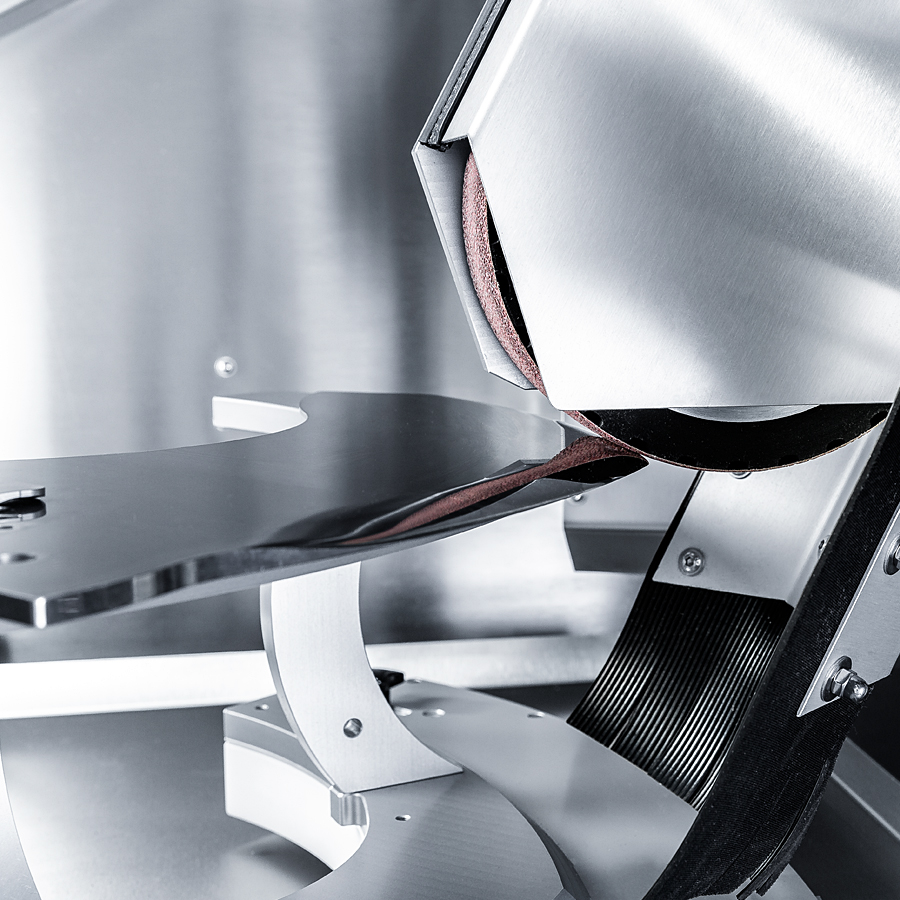 Lorsque l’on presse le bouton «start», le cutter se met en position d’affûtage. Un palpeur vérifie l’usure du cutter et démarre le programme d’affûtage sélectionné. Après avoir été affûtée, la surface du cutter est polie. L’outil de coupe est ensuite démorfilé rapidement, avec ménagement.