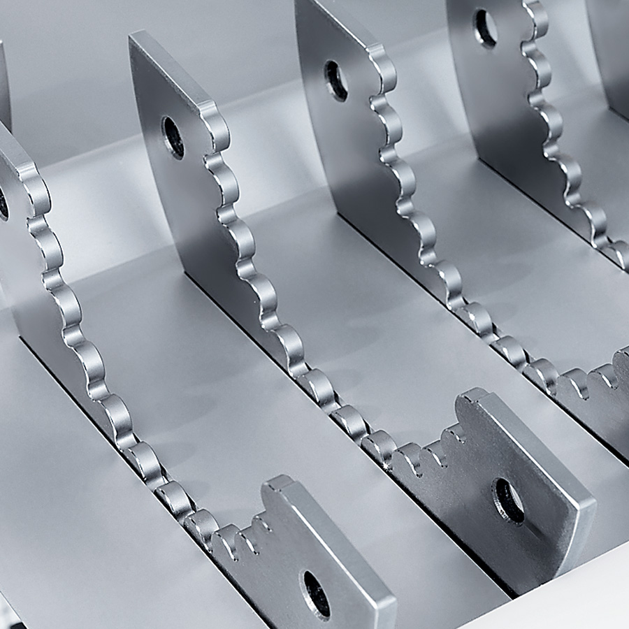 Le chariot à lames peut accueillir jusqu'à 16 lames de cutters. Les lames sont protégées des endommagements par un cache en plastique. Toutes les pièces destinées au montage et au serrage du système de lames sont installées de manière claire sur le chariot.